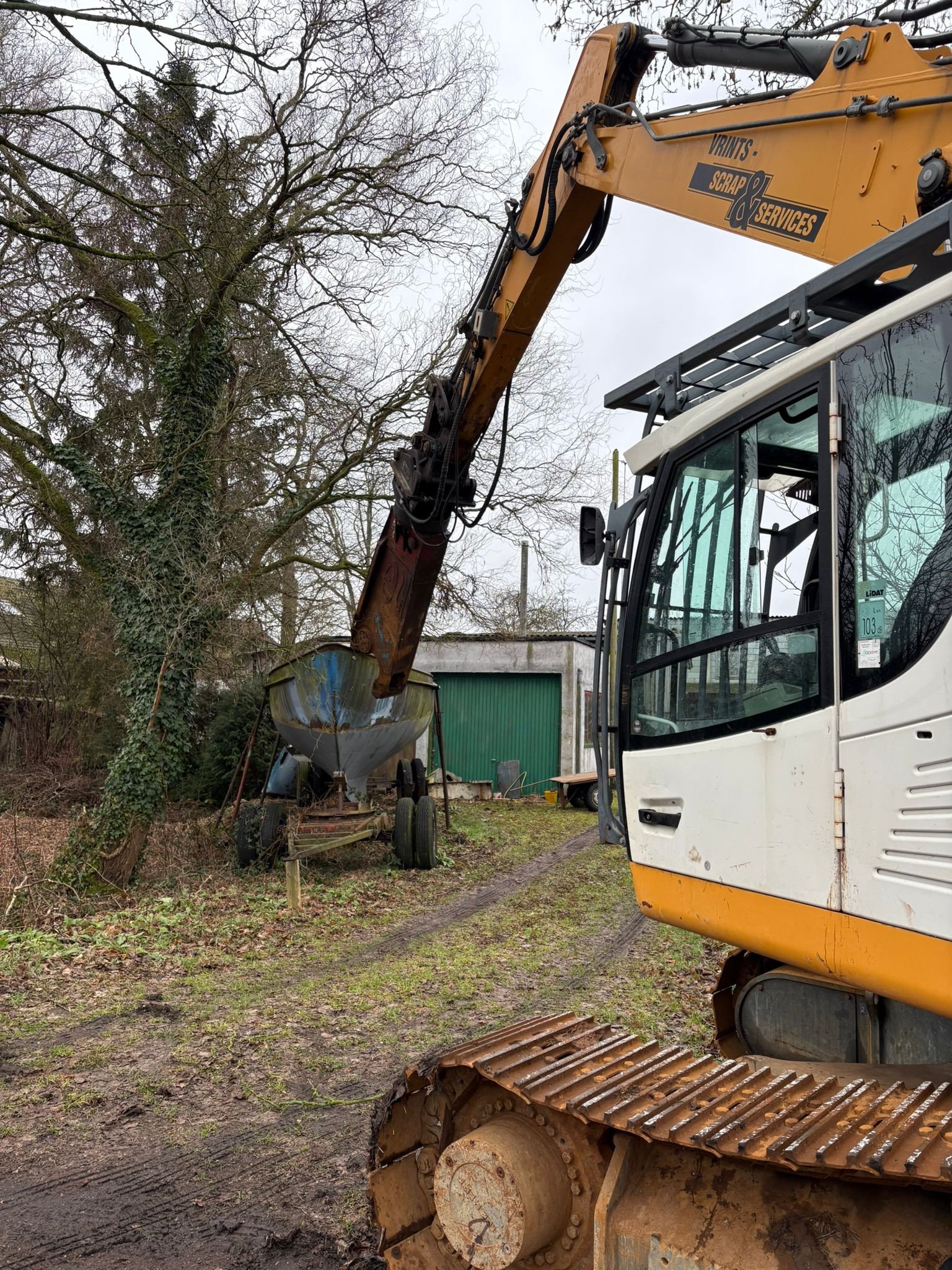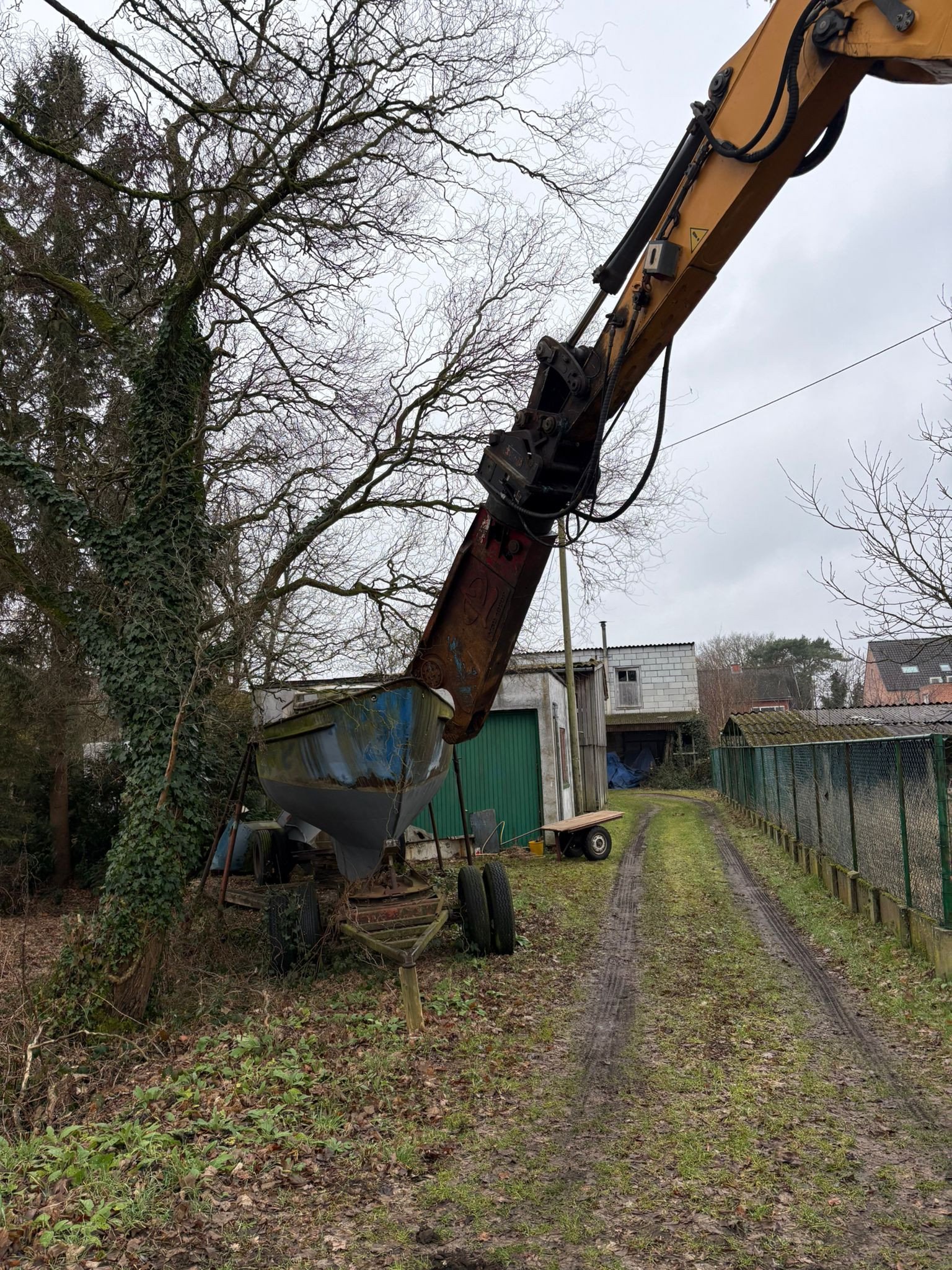 Vrints Scrap & Services werd gevraagd om een metalen boot van ongeveer 9 meter uit een achtertuin te verwijderen.